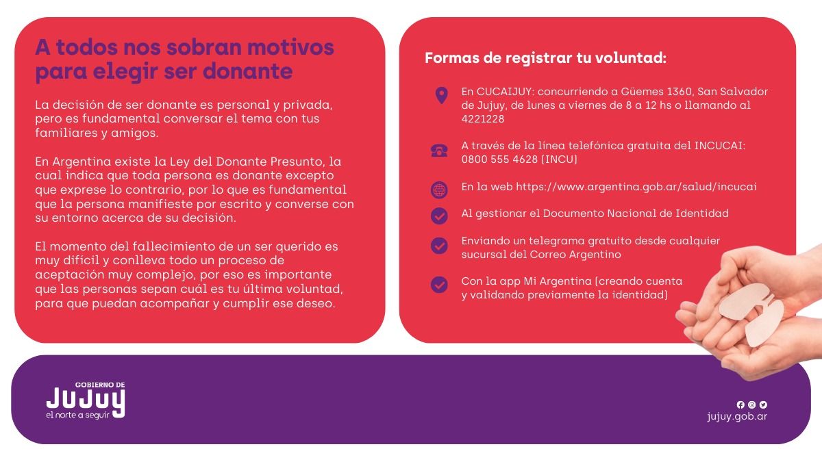 Para registrar este trámite se puede concurrir a la sede del CUCAIJUY en Güemes 1360 de San Salvador, de lunes a viernes de 8 a 12 horas o comunicarse al 4221228. También puede realizarse a través de la línea telefónica gratuita del INCUCAI, 0800 555 4628 (INCU), en la web https://www.argentina.gob.ar/salud/incucai, al gestionar el Documento Nacional de Identidad, enviando un telegrama gratuito desde cualquier sucursal del Correo Argentino o con la app Mi Argentina (creando cuenta y validando previamente la identidad).