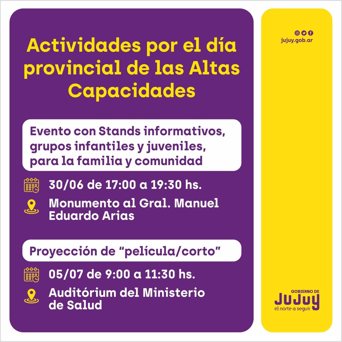 Las mismas comenzarán el día viernes 30 de junio, en el Monumento al Gral. Manuel Eduardo Arias de 17 a 19:30 horas, con un evento para la comunidad con stands informativos, grupos infantiles y juveniles, y continuarán el miércoles 5 de julio, con la proyección de una “Película / Corto” en el Auditórium del Ministerio de Salud, de 9 a 11:30 horas.