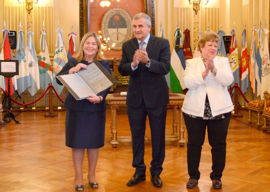 La distinción del Mandatario se realizó en el marco del tradicional saludo protocolar en el Salón de la Bandera. En la oportunidad el Gerardo Morales entregó el Decreto N° 7854 a la Presidente de la Asociación de Mujeres Jueces de la Argentina, Susana Medina de Rizzo donde se la declara Huésped Oficial e Invitada de Honor mientras dure su presencia en la provincia para participar de las Jornadas de Violencia de Genero y Adicciones a desarrollarse en la ciudad de Humahuaca.
