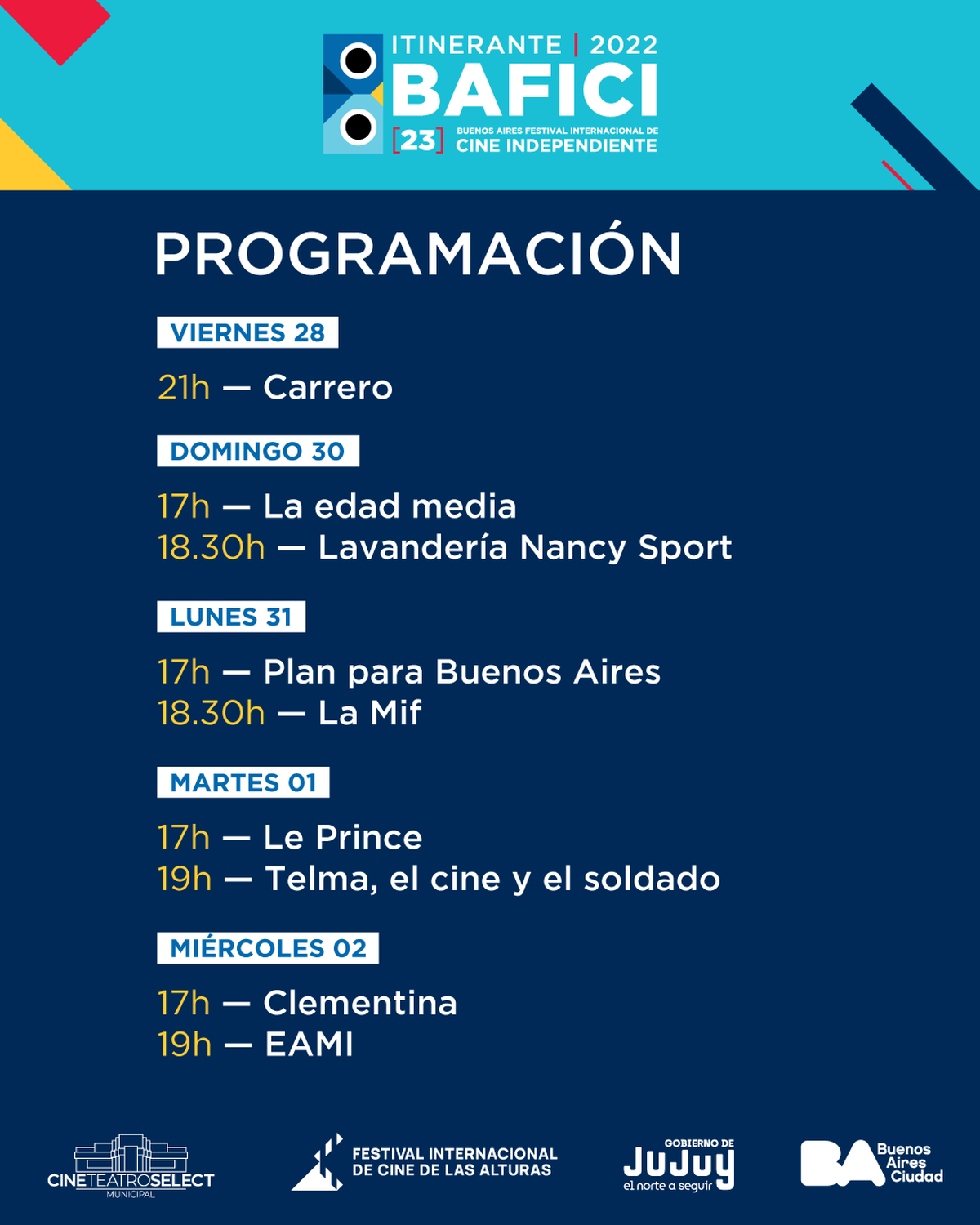 Organizada por el Ministerio de Cultura del Gobierno de la Ciudad de Buenos Aires y el Festival Internacional de Cine de las Alturas, comienza el BAFICI Itinerante del 28 de octubre (el 29 no habrá función) al 2 de noviembre, en San Salvador de Jujuy. Se proyectarán películas en el Cine Teatro Municipal Select, Gral. Alvear 665, de 17 a 20 horas. BAFICI Itinerante tiene como objetivo llevar parte de la programación del festival a otras ciudades de Argentina. Se creó en 1999, con la primera edición del festival, por la necesidad de generar espacios alternativos de exhibición en ciudades de todo el país a las que no llega esa oferta cinematográfica a las carteleras comerciales.