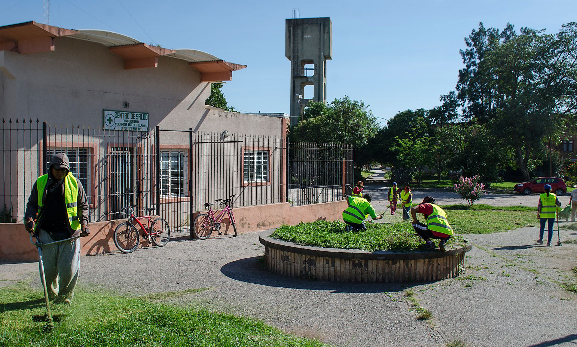 Trabajos de desmalezado, limpieza perimetral y adecuación de espacios comunes en instituciones públicas, se llevan adelante a través del Programa “Jujuy Asiste y Reactiva” en distintos sectores del Barrio Malvinas Argentinas.