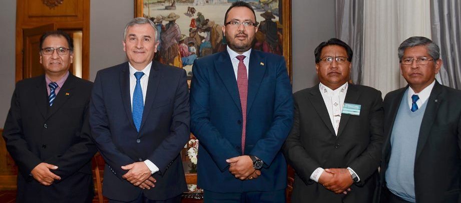 El gobernador Gerardo Morales acompañado por el secretario de Integración Regional y Relacional Internacionales, Carlos Toconás, mantuvo un encuentro con el embajador del Estado Plurinacional de Bolivia en la República Argentina, Santos Javier Tito Veliz; el ministro de Obras Públicas e Infraestructura del país hermano, Milton Claros; y el cónsul boliviano en Jujuy, Nelson Guarachi; a fin de abordar temas prioritarios en la agenda de integración, entre ellos nuevos pasos fronterizos y el ferrocarril.