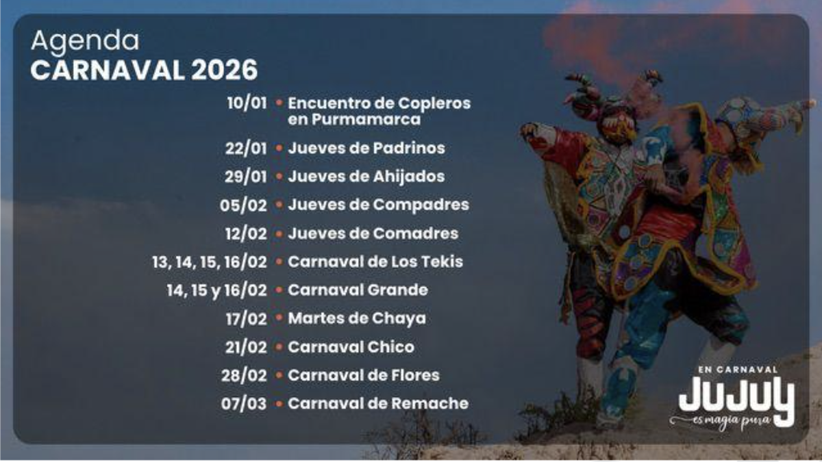 El Carnaval 2026 propone más de dos meses de celebraciones que recorren toda la provincia. No se trata solo de una agenda de eventos, sino de un tiempo colectivo en el que Jujuy expresa su identidad, su historia y su manera de celebrar. Una invitación abierta a participar de una fiesta que se vive en comunidad y que vuelve a convertir al territorio en uno de los grandes escenarios culturales del verano argentino.