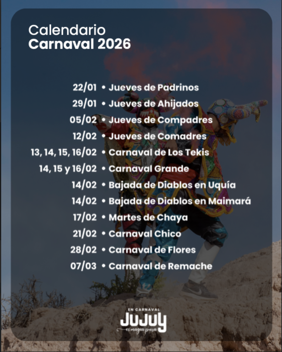 Consulta el cronograma con todas las actividades en https://www.turismo.jujuy.gob.ar/ y en nuestras redes sociales @culturayturismojujuy @visitjujuy.