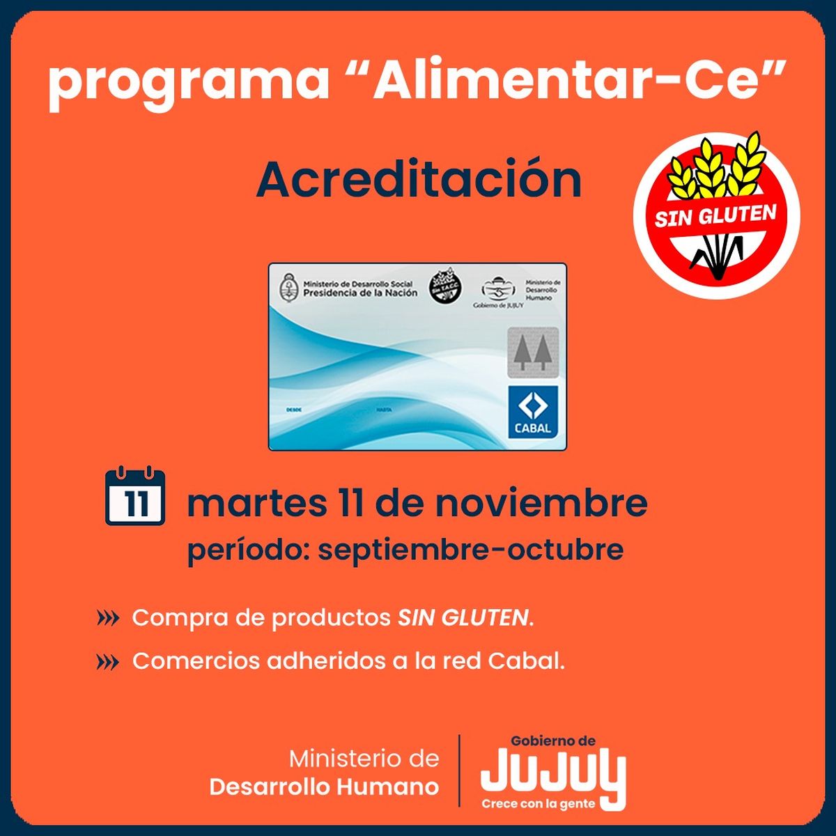 El Ministerio de Desarrollo Humano de Jujuy, a través de la Secretaría de Asistencia Directa, comunica que este martes 11 de noviembre se realizó la acreditación de la tarjeta Alimentar-Ce destinada a personas celíacas titulares del programa “Alimentar-Ce”.