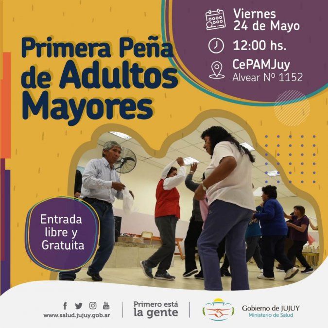 El Centro Provincial de Adultos Mayores de Jujuy convoca a participar de la gran peña que realizará la Institución el dia viernes 24 de mayo a partir de las 12 hs en Calle Alvear 1152. Cabe destacar, que la actividad apunta a ofrecer un espacio de encuentro y esparcimiento para los abuelos con carácter totalmente gratuito.