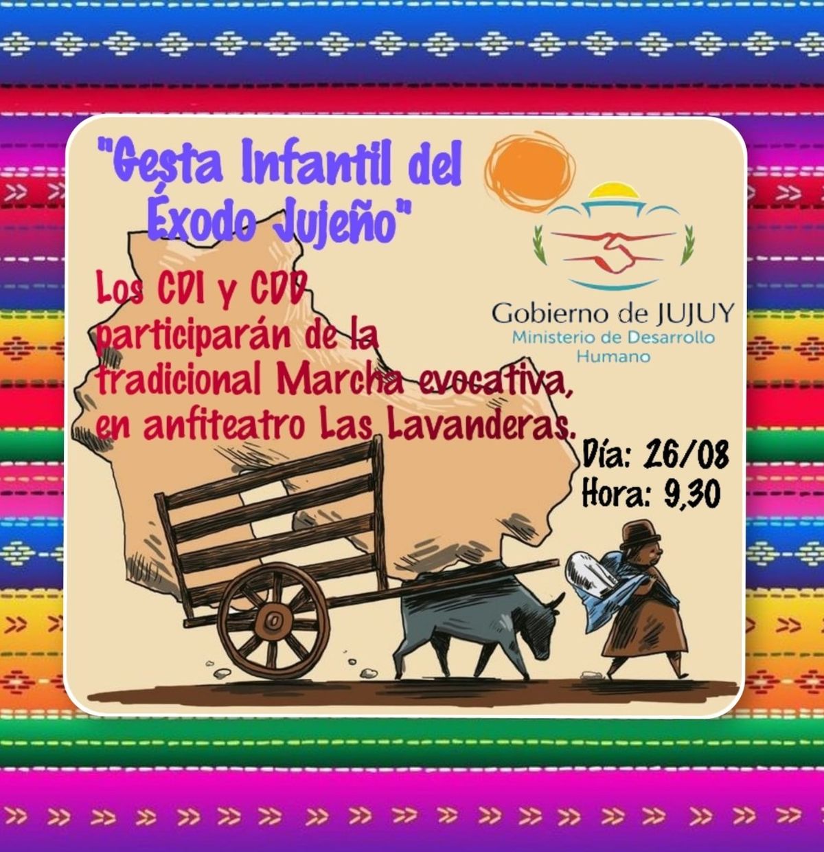 En el marco por el “Éxodo Jujeño” niños y niñas que asisten a los diferentes Centros de Desarrollo Infantil (CDI) y Centros de Día (CDD) dependientes de la Secretaría de Niñez, Adolescencia y Familia del Ministerio de Desarrollo Humano realizarán un acto conmemorativo el día viernes 26 en el Anfiteatro “Las Lavanderas” ubicado en el Parque Lineal “Xibi – Xibi”.