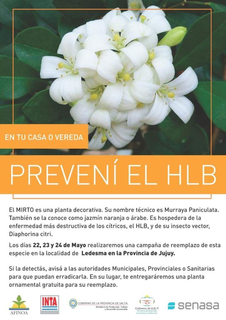 El mirto, «jazmín» o “siempre verde” alberga el insecto ’Diaphorina citri’ -conocido vulgarmente como “chicharrita”- el cual permite la transmisión del HLB, la principal amenaza a los cultivos citrícolas. Jujuy está libre de esta enfermedad, por lo que se apunta a sostener este status en beneficio del ámbito productivo.