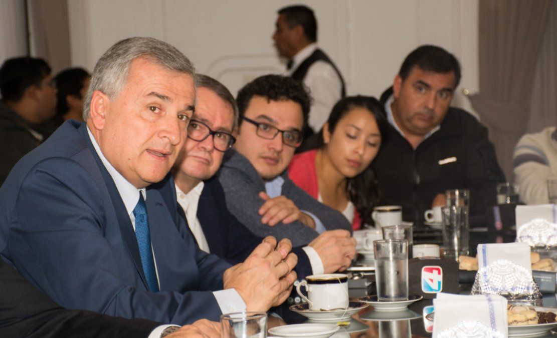 Acompañaron al gobernador en la rueda y desayuno de prensa, el presidente del directorio de Jujuy Energía y Minería Sociedad del Estado (JEMSE), José María Palomares; el titular del Banco de Desarrollo, Marcelo Fernández; el secretario de Energía, Mario Pizarro; y el secretario de Asuntos Legales, Gastón Morales.