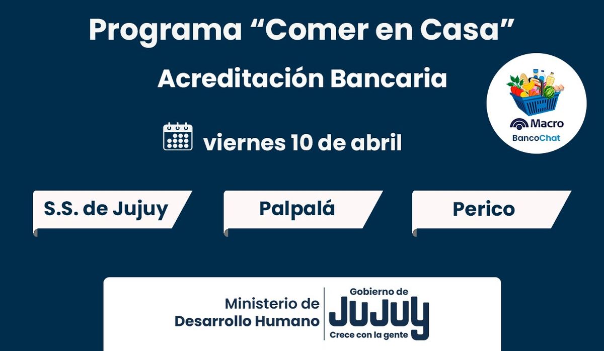 El Ministerio de Desarrollo Humano, mediante la Secretaría de Asistencia Directa, comunica que este viernes 10 de abril, se concretó la acreditación bancaria del programa “ Comer en Casa”, destinada a los titulares de San Salvador de Jujuy, Palpalá y Perico.