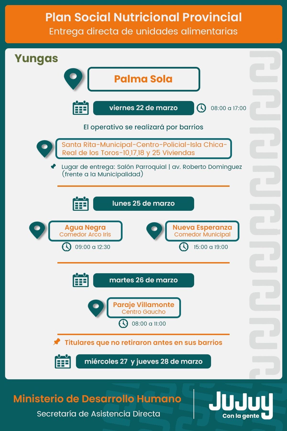 En tanto que, en Palma Sola, se concretará desde el viernes 22 al jueves 28 de marzo, donde la entrega de unidades alimentarias se concretará por los barrios de la localidad, de la siguiente forma: