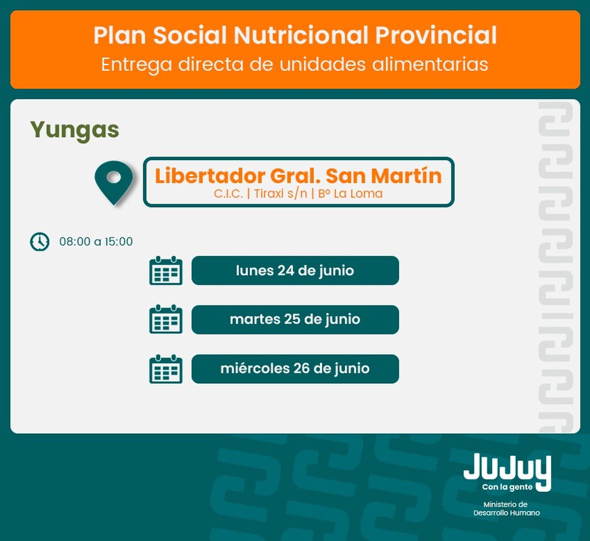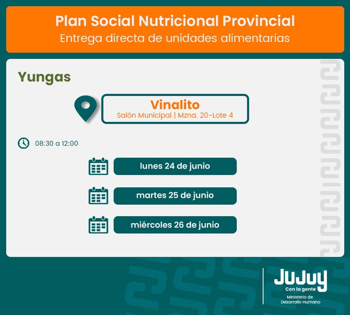El Ministerio de Desarrollo Humano, mediante la Secretaría de Asistencia Directa, comunica de a partir del lunes 24 de junio, se llevará a cabo la entrega de módulos alimentarios del programa “Comer en Casa”, a las familias de Libertador General San Martín, Caimancito, Calilegua y Vinalito.