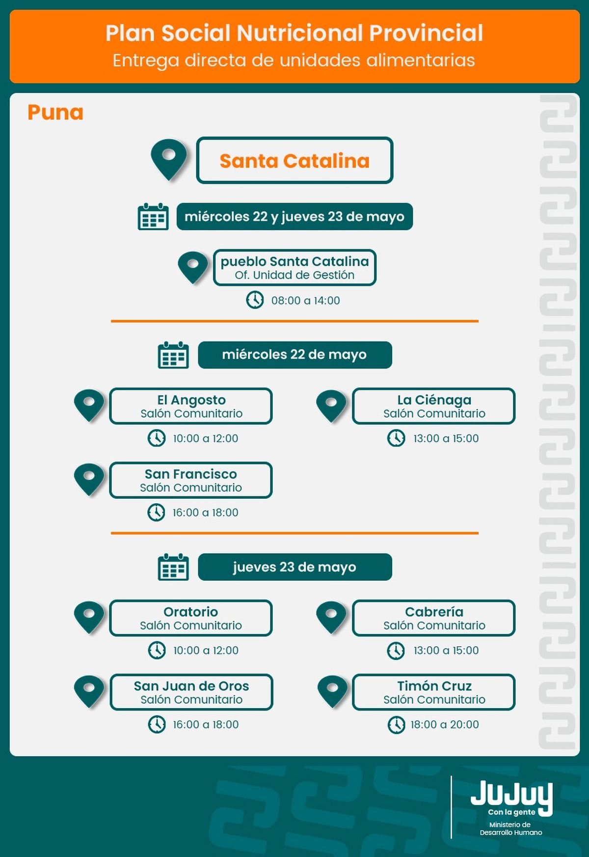 Miércoles 22 de mayo, el operativo comenzará en El Angosto, en el Salón Comunitario en el horario de 10:00 a 12:00. Por la tarde continuará en La Ciénaga, en el Salón Comunitario, en el horario de 13:00 a 15:00 y finalizará en San Francisco, en el Salón Comunitario, en el horario de 16:00 a 18:00.