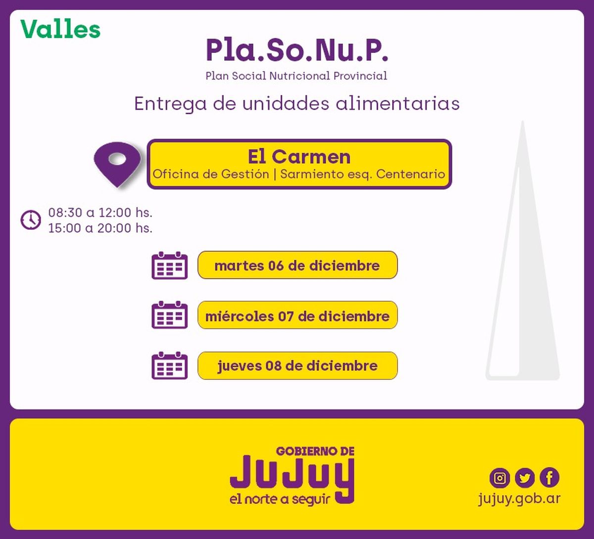El Ministerio de Desarrollo Humano, a través de la Secretaría de Asistencia Directa y Calidad de Vida, informa que a partir del martes 06 de diciembre, se concretará la entrega de unidades alimentarias del Programa “Comer en Casa”, a familias de El Carmen.
