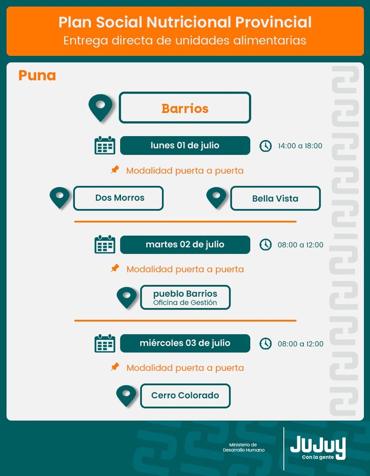 El Ministerio de Desarrollo Humano, mediante la Secretaría de Asistencia Directa, comunica que, desde este lunes 01 de julio, se lleva a cabo la entrega de módulos alimentarios del programa “Comer en Casa”, destinados a familias de Barrios y Yavi.