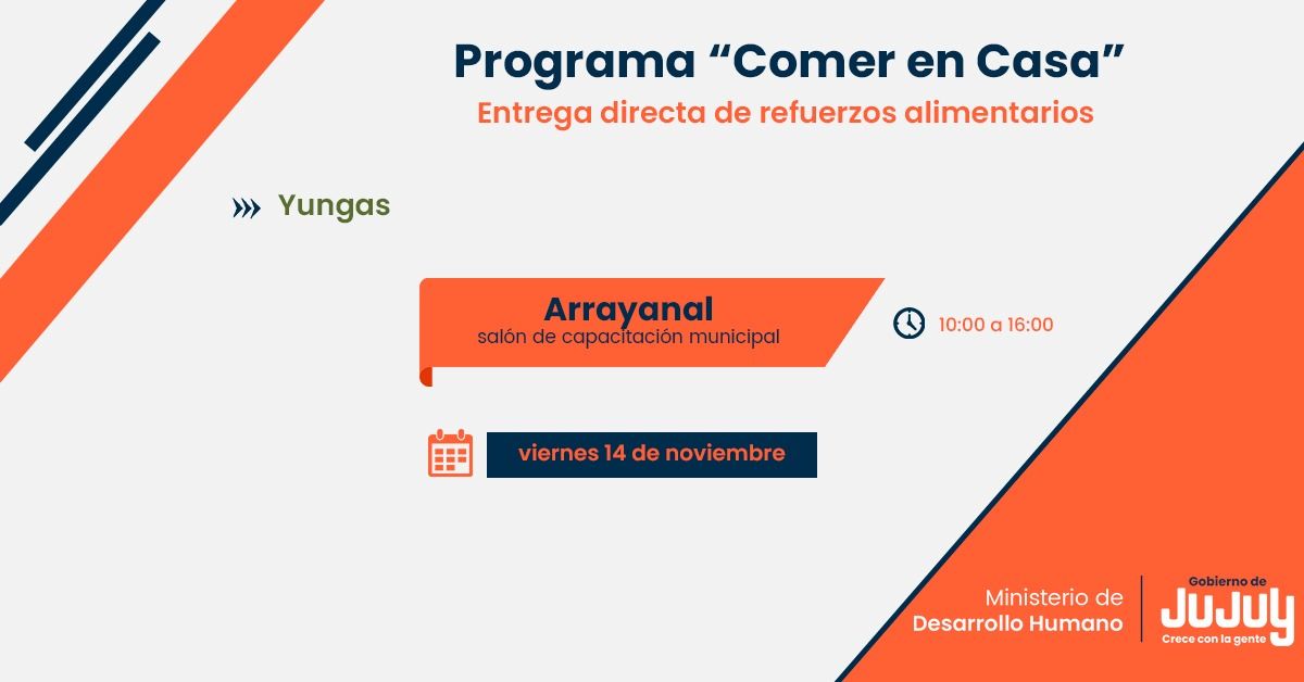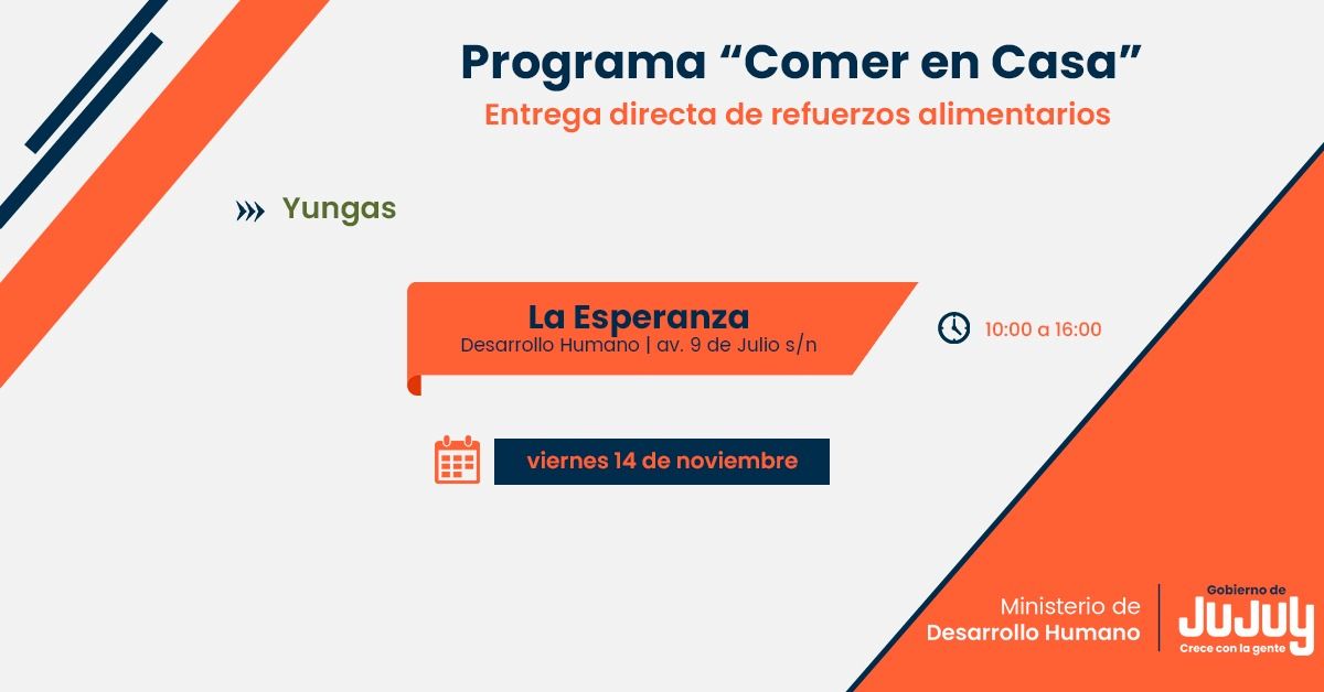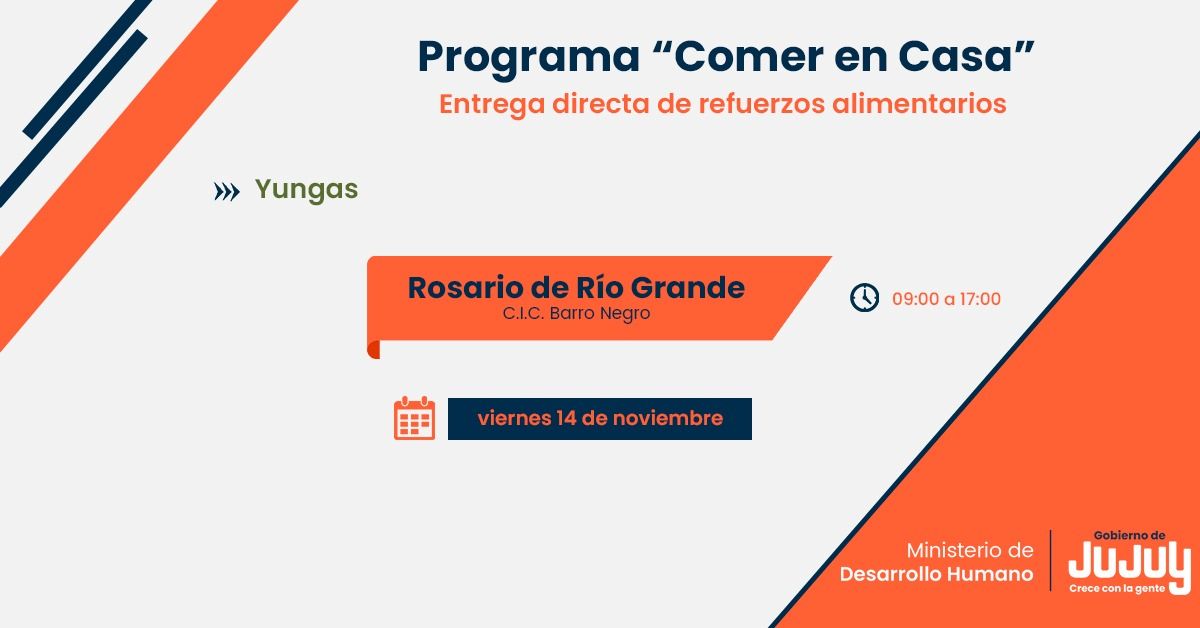 El Ministerio de Desarrollo Humano de Jujuy, mediante la Secretaría de Asistencia Directa, comunica que el viernes 14 de noviembre se llevará a cabo la entrega directa de módulos alimentarios del programa “Comer en Casa”, en Arrayanal, La Esperanza, La Mendieta, Rosario de Río Grande y San Pedro de Jujuy.