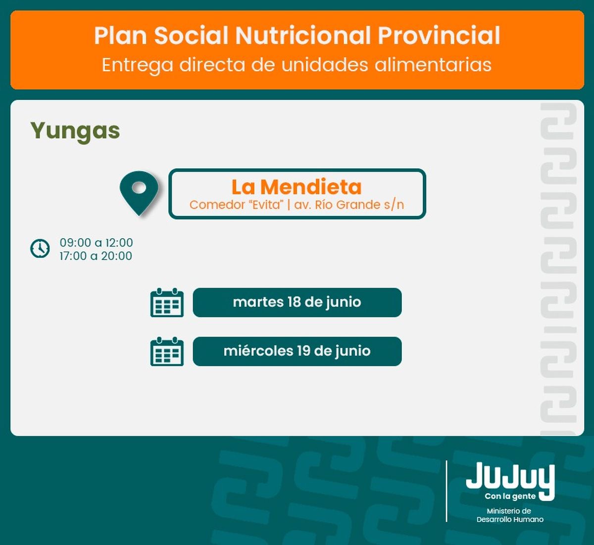 El Ministerio de Desarrollo Humano, a través de la Secretaría de Asistencia Directa, comunica que los días martes 18 y miércoles 19 de junio, se efectuará la entrega directa de módulos alimentarios del programa “Comer en Casa”, a familias de La Mendieta y Rodeito.