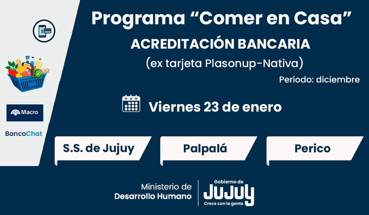 El Ministerio de Desarrollo Humano, mediante la Secretaría de Asistencia Directa, comunicó que el viernes 23 de enero, se llevó a cabo la acreditación bancaria del programa “Comer en Casa”, para titulares de San Salvador de Jujuy, Palpalá y Perico.