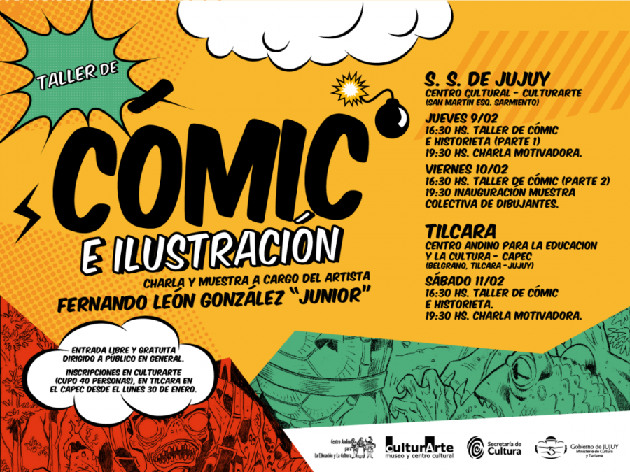 La Secretaría de Cultura invita al público en general y especialmente a los aficionados a las historietas a participar del Taller “Comic e Ilustración “ a cargo del prestigioso Fernando León González “Junior” que se dictará en los días 9 y 10 en Culturarte, donde además habrá una Muestra colectiva, y en el Centro Andino para la Educación y la Cultura (CAPEC) de Tilcara el 11 del presente mes, a partir de las 16,30 horas. Además habrá una Muestra Colectiva de Historietas.