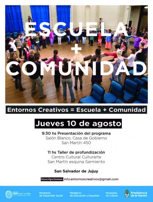 El Ministerio de Cultura y Turismo de Jujuy, a través de la Dirección de Derechos Culturales, en coordinación con la Secretaría de Gestión Educativa y la Dirección de Educación Secundaria, invita a organizaciones comunitarias, escuelas, artistas y representantes gubernamentales, a participar de la presentación del Programa “Entornos Creativos” que se realizará este jueves 10 de agosto a las 9.30 horas en el Salón Blanco de la Casa de Gobierno de Jujuy.