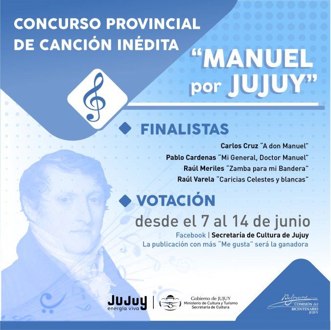 La Secretaría de Cultura invita a la comunidad en general a votar desde el próximo lunes 7 y hasta el 14 del presente mes, los cuatro temas finalistas del Concurso Provincial de Canción Inédita “Manuel por Jujuy”. La votación se habilita en el Facebook de la Secretaría de Cultura. La canción inédita con más “Me Gusta” será la ganadora del certamen.