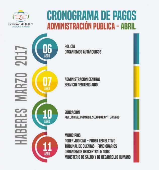 Tesorería de la Provincia anunció el cronograma de pagos de haberes netos para los empleados de la administración pública provincial y municipal por el período marzo 2017, el que se concretará de la siguiente manera: