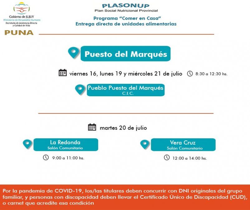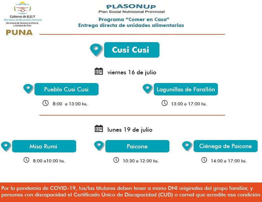 El operativo de entrega directa se diagramó entre el equipo técnico del Plan Social Nutricional Provincial (Pla.So.Nu.P.) y municipios de la Puna, el cual se efectuará respetando el protocolo de bioseguridad recomendado por el Comité Operativo de Emergencia (COE) Provincial, para reducir las posibilidades de contagio de coronavirus.