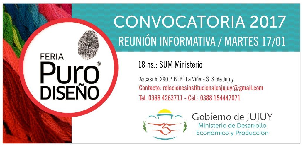 “Estamos convocando a todos los interesados, emprendedores y diseñadores, que quieran estar presentes en el stand de Jujuy, a participar de una primera reunión informativa, que vamos a realizar en el Ministerio de Desarrollo Económico y Producción, el día martes 17 de enero, a las 18 hs”.