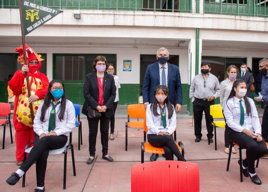 En el contexto de pandemia y debido a que la curva de contagios sigue en baja en la provincia, el Gobernador Gerardo Morales participó de la apertura de clases presenciales para los alumnos que cursan el último año de primaria y el último de secundaria.