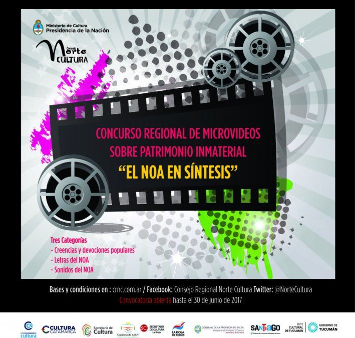 La Secretaría de Cultura de Jujuy informó que el Consejo Regional Norte Cultura, convoca a participar del concurso de micro videos “El NOA en síntesis”, que apuesta a divulgar la riqueza del patrimonio inmaterial del NOA a través de la producción audiovisual. Los materiales podrán ser presentados hasta el 30 de junio del corriente año.