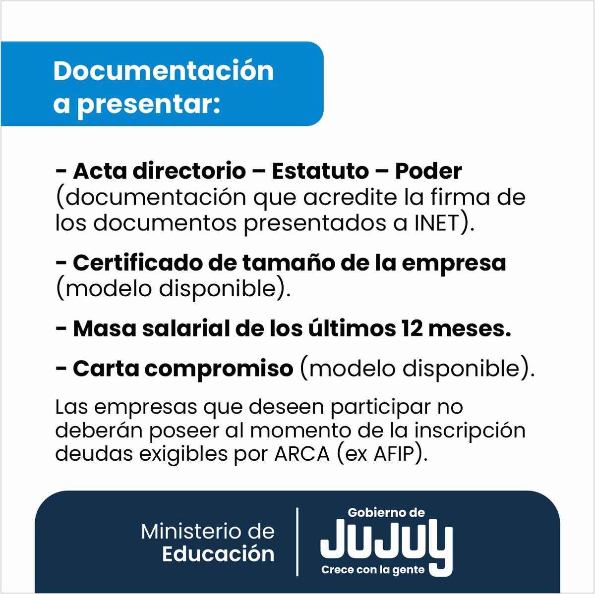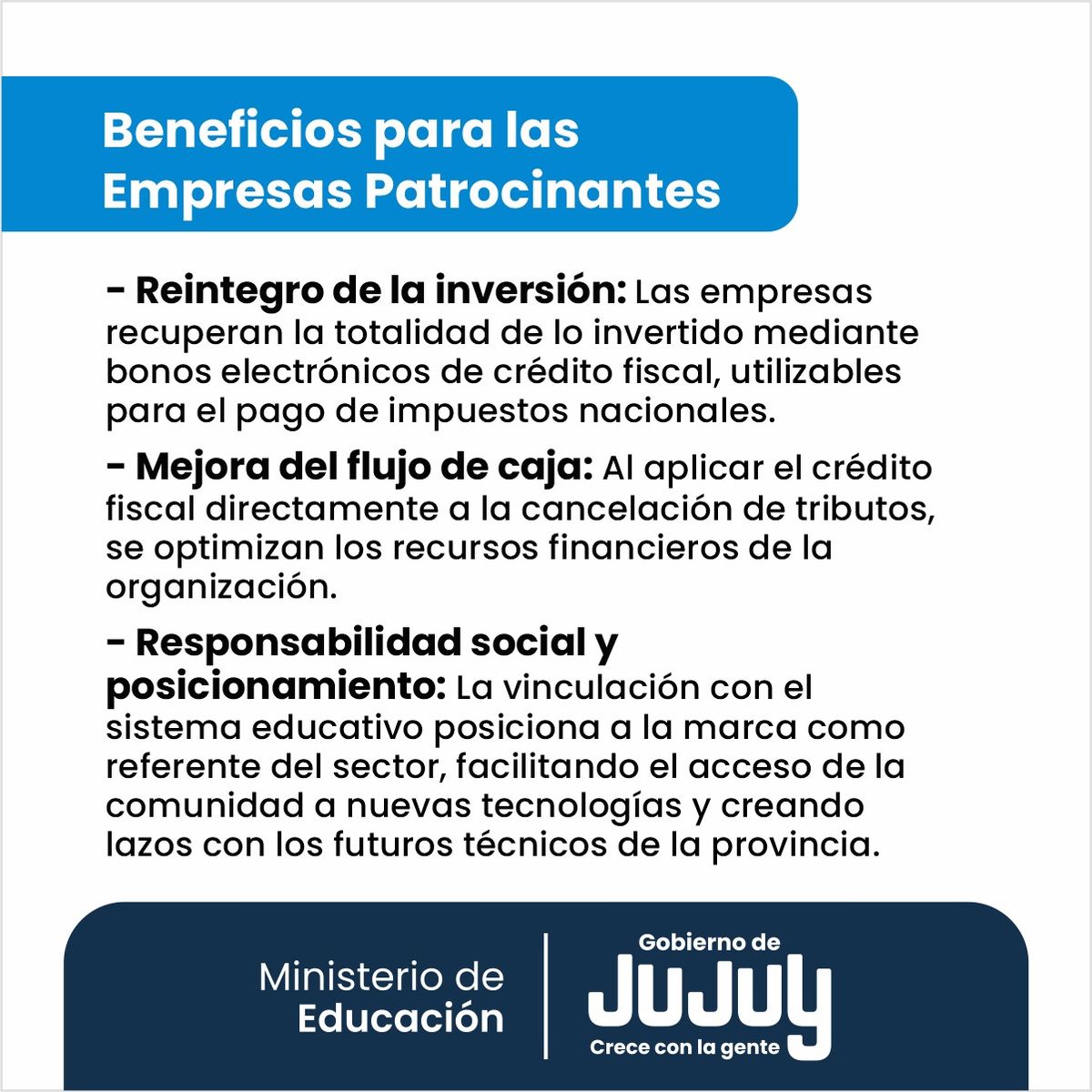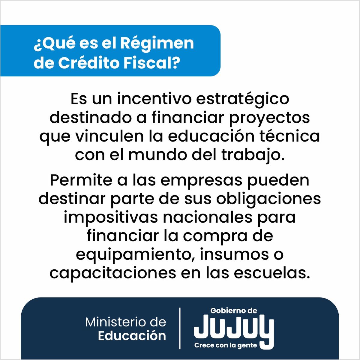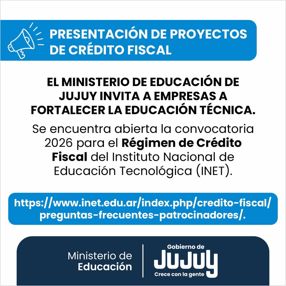 La Dirección de Educación Técnico Profesional (DETP), dependiente del Ministerio de Educación de Jujuy, convoca a las empresas y sectores productivos de la provincia a participar del programa de Crédito Fiscal 2026.