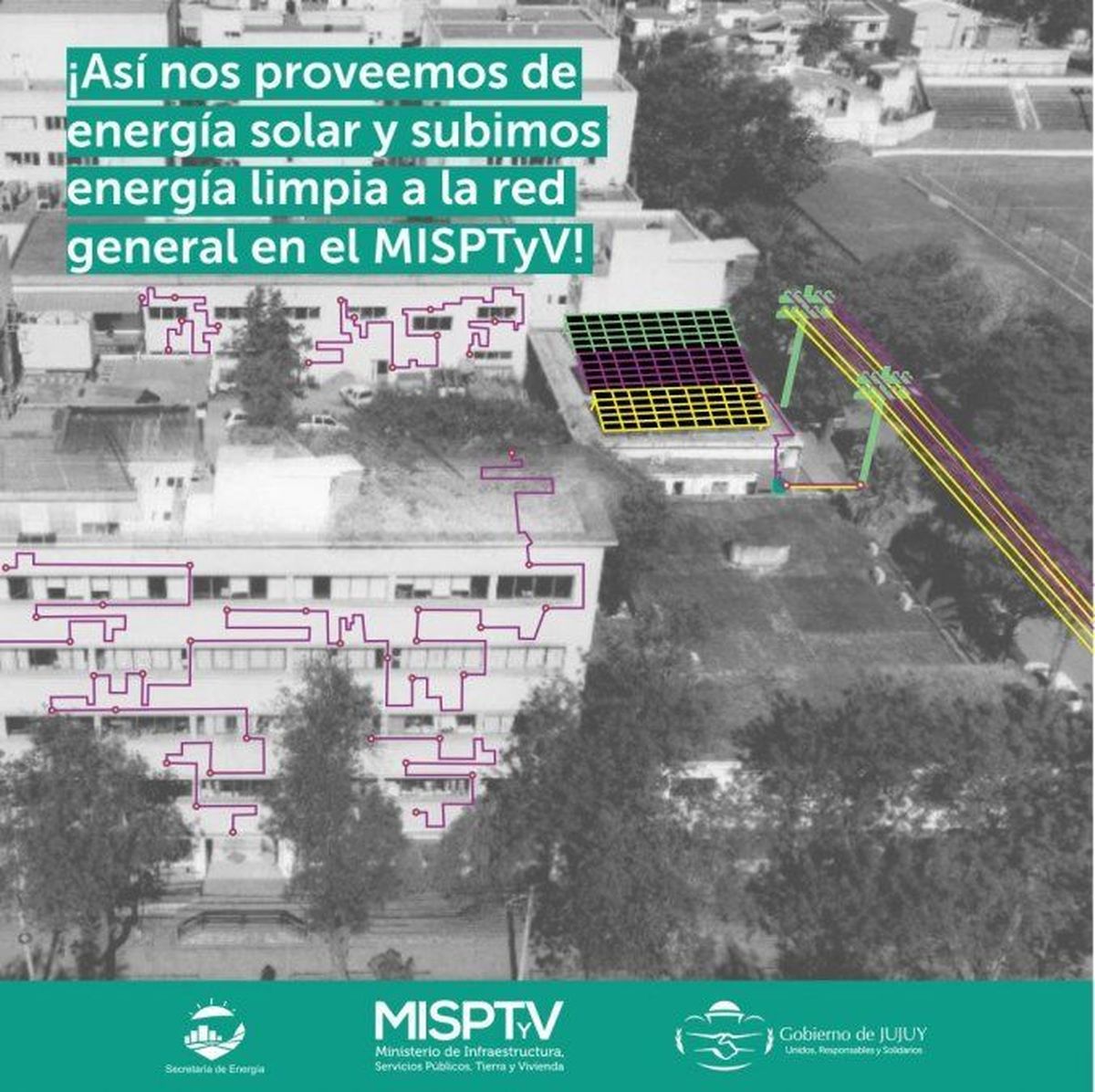 Cabe recordar que el generador fotovoltaico del MISPTyV configuró al edificio como el primero de oficinas públicas con energía solar en el marco de la generación distribuida de energías renovables (pueden verse imágenes explicativas aquí), contando Jujuy con otras experiencias en ese marco en las EET 1 y 2, como también con proyectos en el Plan Maestro Plurianual de Desarrollo Jujuy 2021-2023 que le brindaran a la provincia generación distribuida de energía limpia en 12 puntos más.