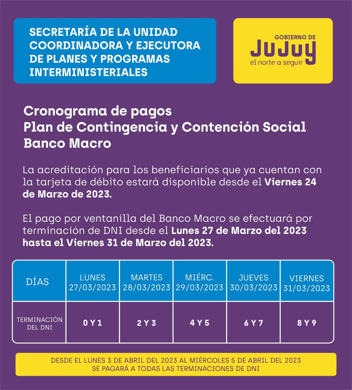 Por último, se adelantó que, desde el lunes 3 de Abril al viernes 07 de abril del 2023, se pagará a todas las terminaciones de DNI.