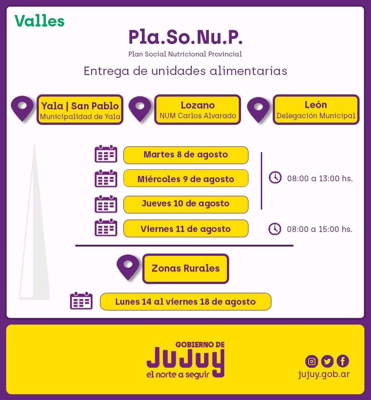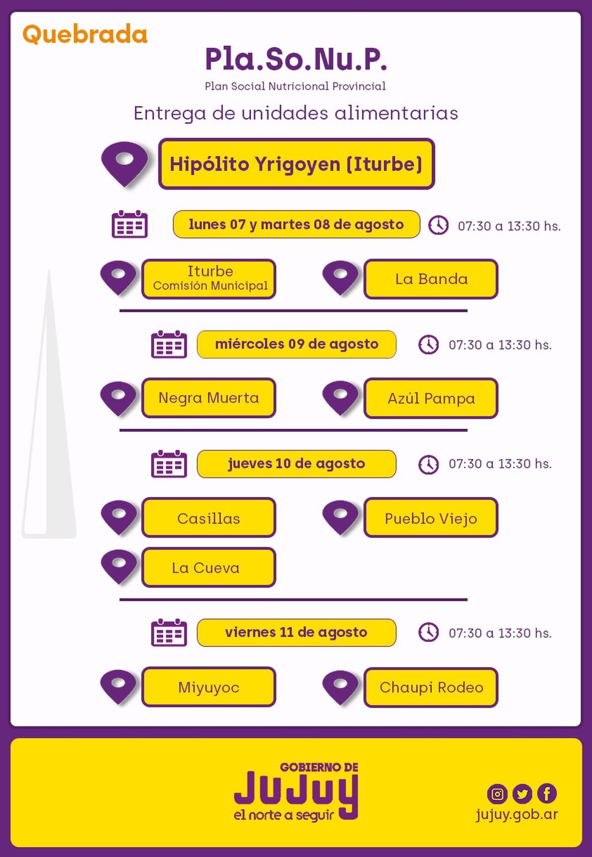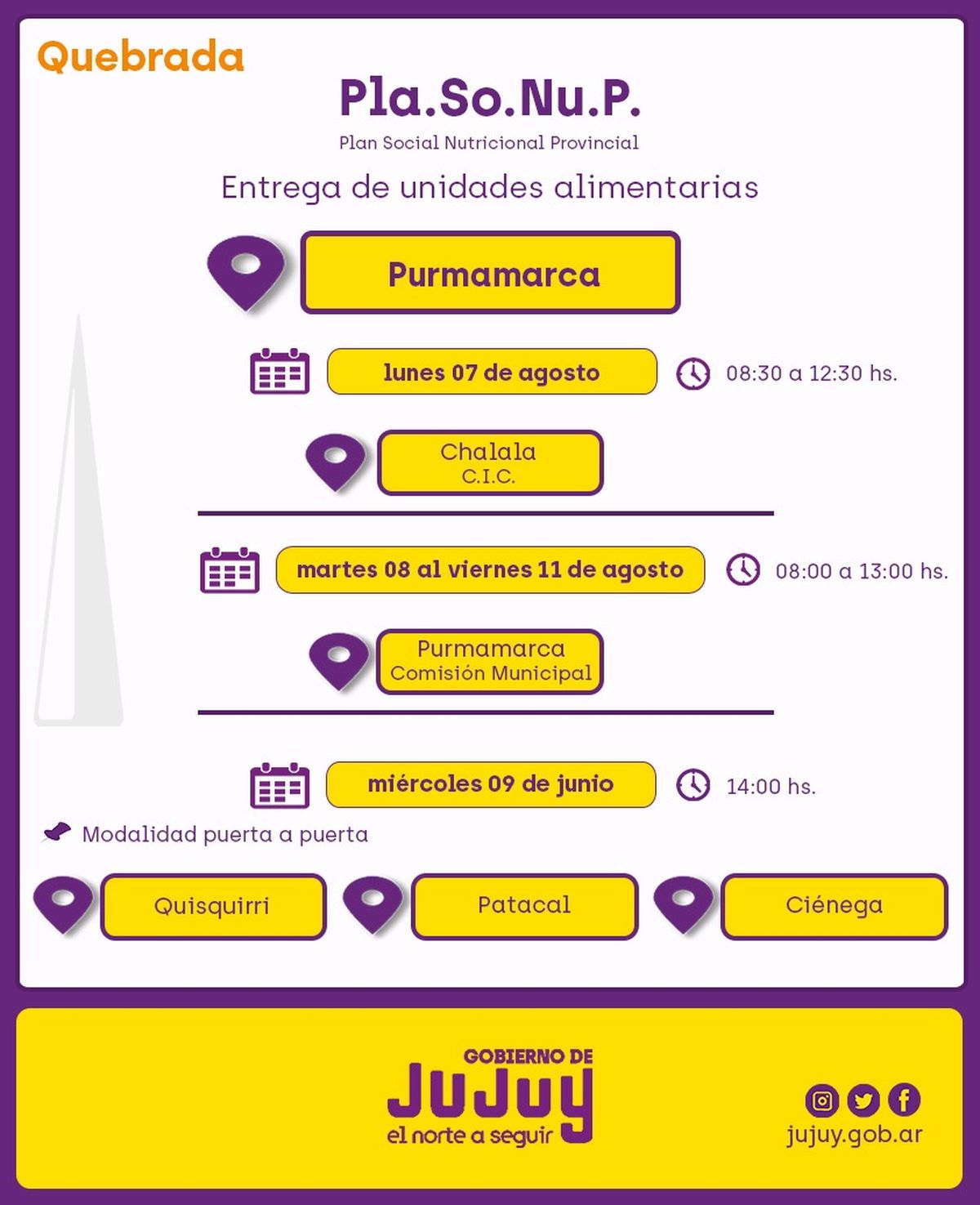 Martes 8, miércoles 9, jueves 10 y viernes 11 agosto, se concretará en el pueblo Purmamarca, en la Comisión Municipal, en el horario de 08:00 a 13:00.