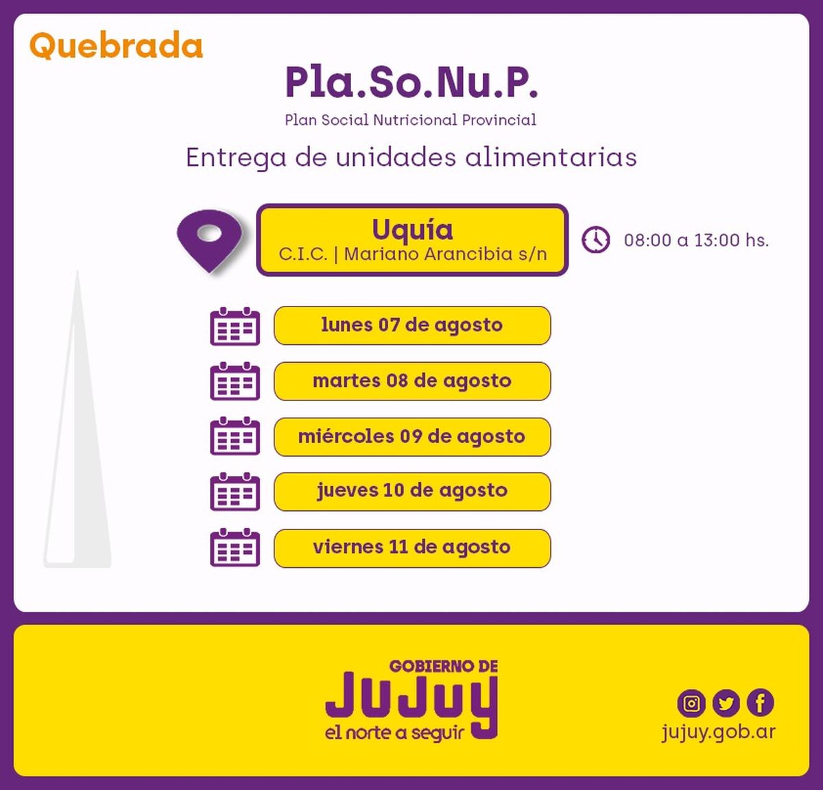 -En Uquía, se ejecutará los días lunes 07, martes 08, miércoles 09, jueves 10 y viernes 11 de agosto, en el Centro Integrador Comunitario, ubicado en Mariano Arancibia s/n, en el horario de 08:00 a 13:00.