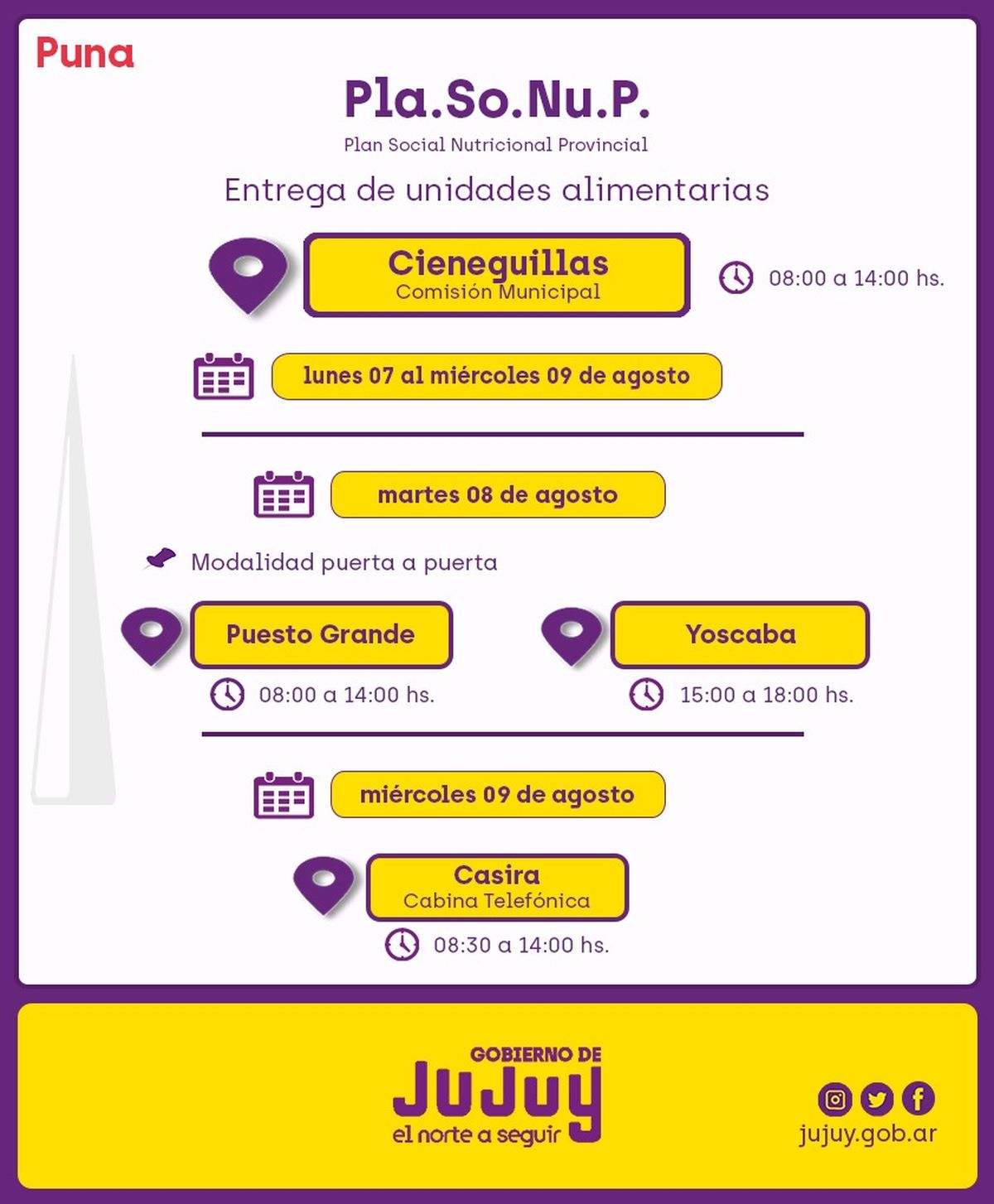 Miércoles 9 de agosto, terminará en Quisquirri, Patacal y Ciénaga, con la modalidad puerta a puerta, desde las 14:00 horas.