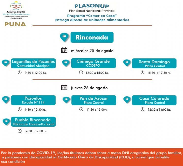 El Ministerio de Desarrollo Humano, a través de la Secretaría de Asistencia Directa y Calidad de Vida, comunica que desde hoy miércoles 25 de agosto se realiza la entrega de unidades alimentarias del Programa “Comer en Casa”, a familias de Rinconada y Abralaite .