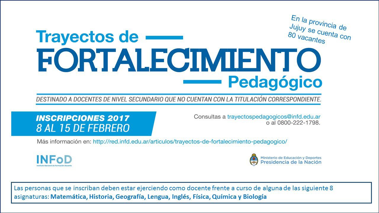 Se trata de tres propuestas formativas que están dirigidas a docentes de nivel medio en ejercicio y sin la titulación correspondiente. La modalidad de cursada es cursado virtual, con instancias presenciales localizadas en Institutos Superiores de Formación Docente de las jurisdicciones, siendo la pre-inscripción desde el 8 hasta el 15 de febrero de 2017. http://red.infd.edu.ar/articulos/trayectos-de-fortalecimiento-pedagogico/