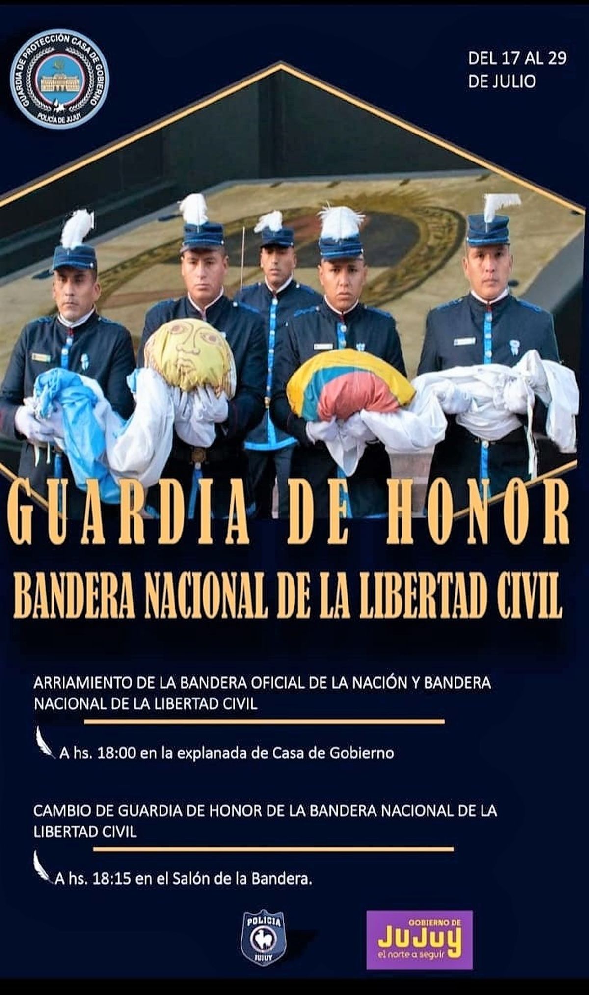 La ceremonia de arriamiento de la Bandera Oficial de la Nación y de la Bandera Nacional de la Libertad Civil se desarrollará a las 18 hs. en la explanada del edificio gubernamental. Seguidamente, a las 18.15, se ejecutará el cambio de Guardia de Honor de la Bandera Nacional de la Libertad Civil en el Salón de la Bandera.