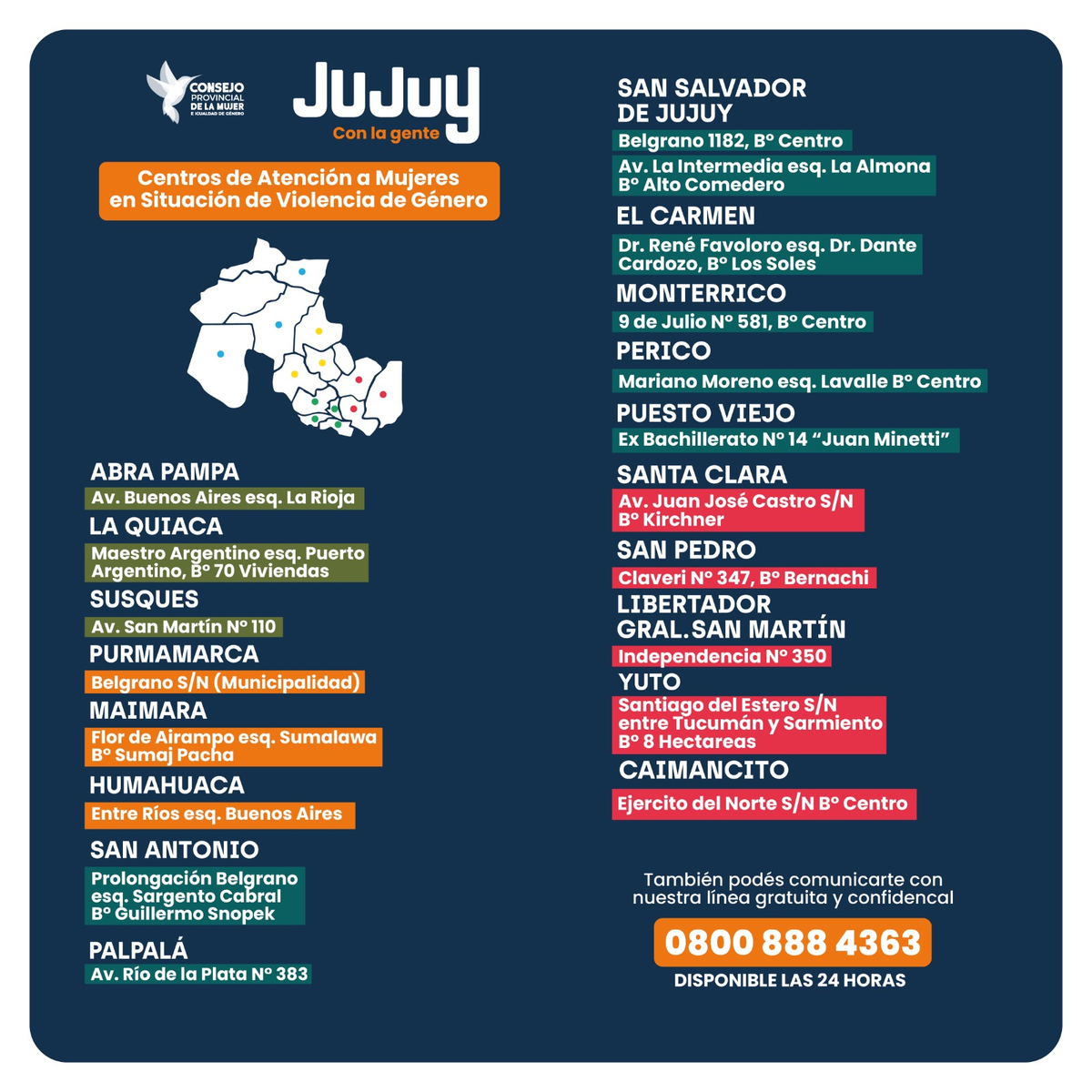 Otro de los recursos disponibles es la línea provincial “Podemos hablar. Jujuy te escucha”, 0 800 888 4363 donde un equipo altamente capacitado recepciona los llamados de urgencia y activa de inmediato los protocolos establecidos para tal fin. Asimismo brinda información a personas que consultan sobre posibles casos de violencia de género. La línea funciona las 24 horas todos los días del año; es gratuita y confidencial.