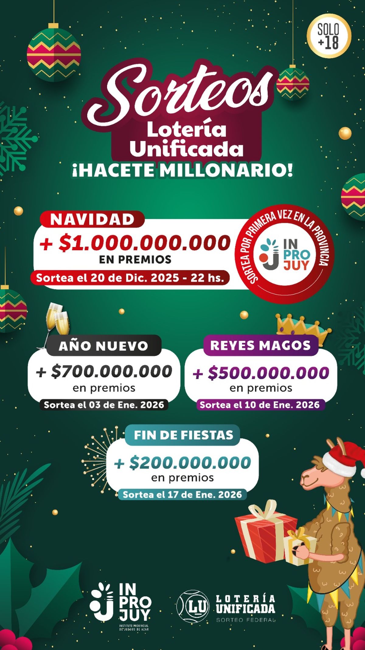 El Instituto Provincial de Juegos de Azar de Jujuy (INPROJUY) anuncia con orgullo que la provincia será sede del Sorteo Extraordinario de Navidad de Lotería Unificada 2025, uno de los eventos más esperados del año en el calendario oficial de las loterías argentinas.