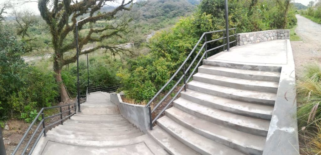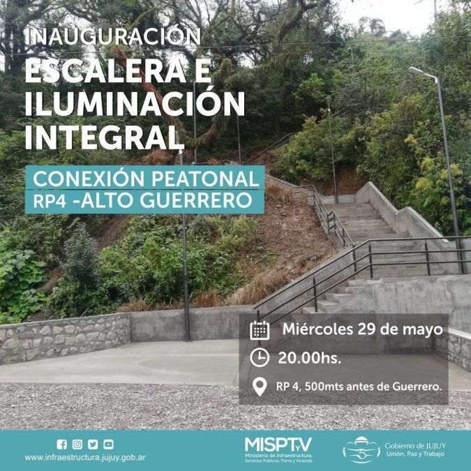 El ministerio de Infraestructura realizó la obra de conexión peatonal entre la Ruta Provincial 4, altura Guerrero, y el sector de los barrios altos del pueblo, que se inaugurará esta noche. Implicó la construcción de una extensa escalera entre los distintos niveles, las barandas de seguridad y la iluminación integral.