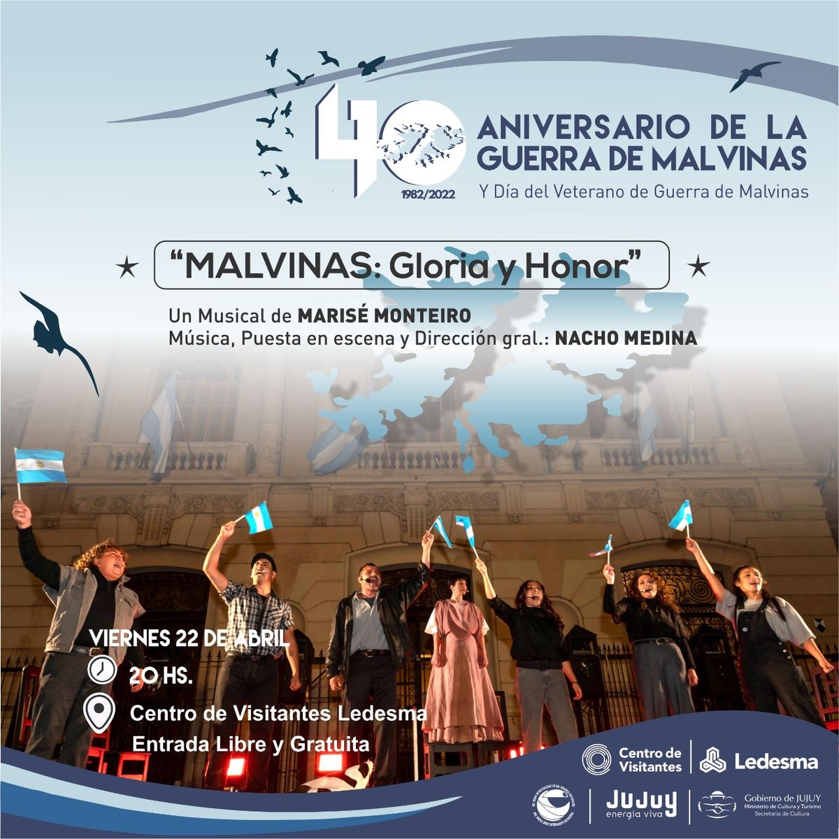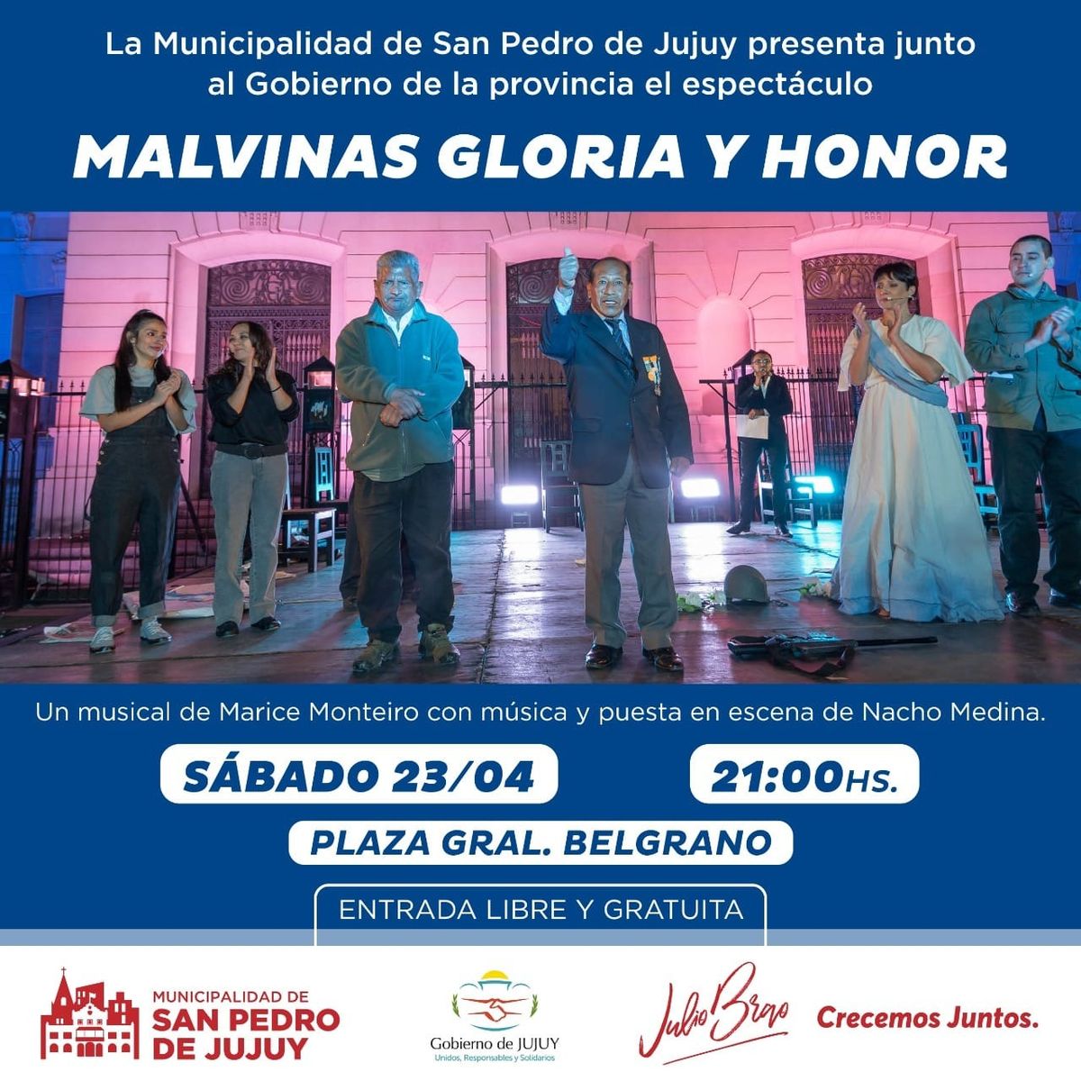 La Secretaría de Cultura junto a las comunas de Libertador General San Martín y San Pedro, invita a la comunidad de ambas localidades y zonas aledañas a participar de la obra musical “Malvinas: Gloria y Honor” que fue ovacionada durante el estreno que se llevó adelante en la explanada de ingreso a Casa de Gobierno, en el marco del programa de actividades del “Cuadragésimo Aniversario de la Guerra de Malvinas y Día del Veterano de Guerra de Malvinas”.
