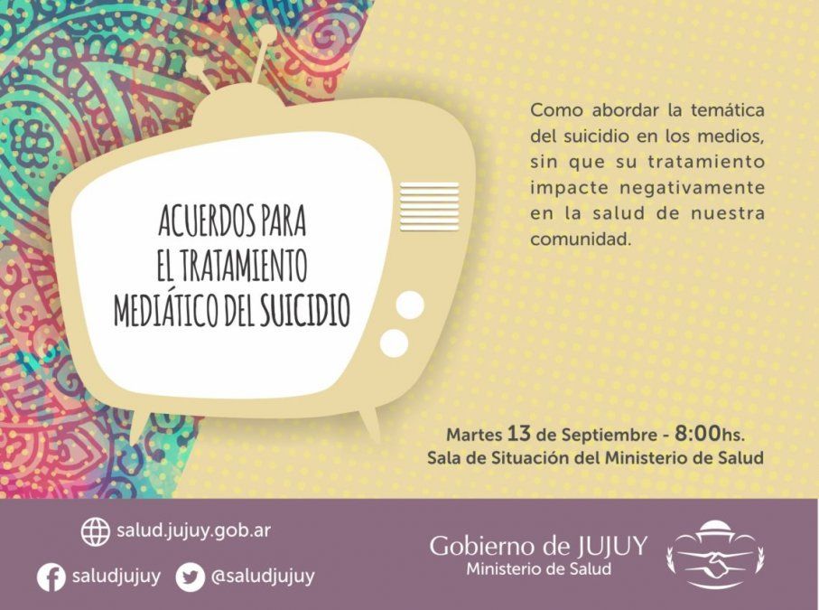 La cartera sanitaria desarrollará una jornada taller para el “Tratamiento de suicidio en los medios” , dictado a periodistas. Se realizará el próximo martes 13 a las 8 horas, en sala de situación del Ministerio de Salud y tendrá por objetivo abordar la temática en los medios, sin que su tratamiento impacte negativamente en la salud de la comunidad.