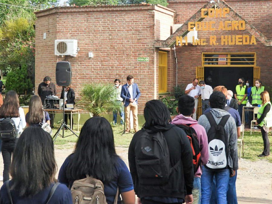 El Ministro Normando Álvarez García junto al secretario de Empleo, Pablo Mayan; director Provincial de Delegaciones Regionales, Marcelo Robles; la coordinadora de COPRETI, Jimena Sánchez de Bustamante y el coordinador del Observatorio Socio Laboral, Héctor Carril acompañaron el acto de inicio del ciclo lectivo 2021 de la Escuela Provincial Agrotécnica N° 7, Ingeniero Ricardo Hueda. Además, estuvo presente director de Ganadería de la Provincia, Gabriel Giubergia en representación del Ministerio de Desarrollo Económico y Producción.
