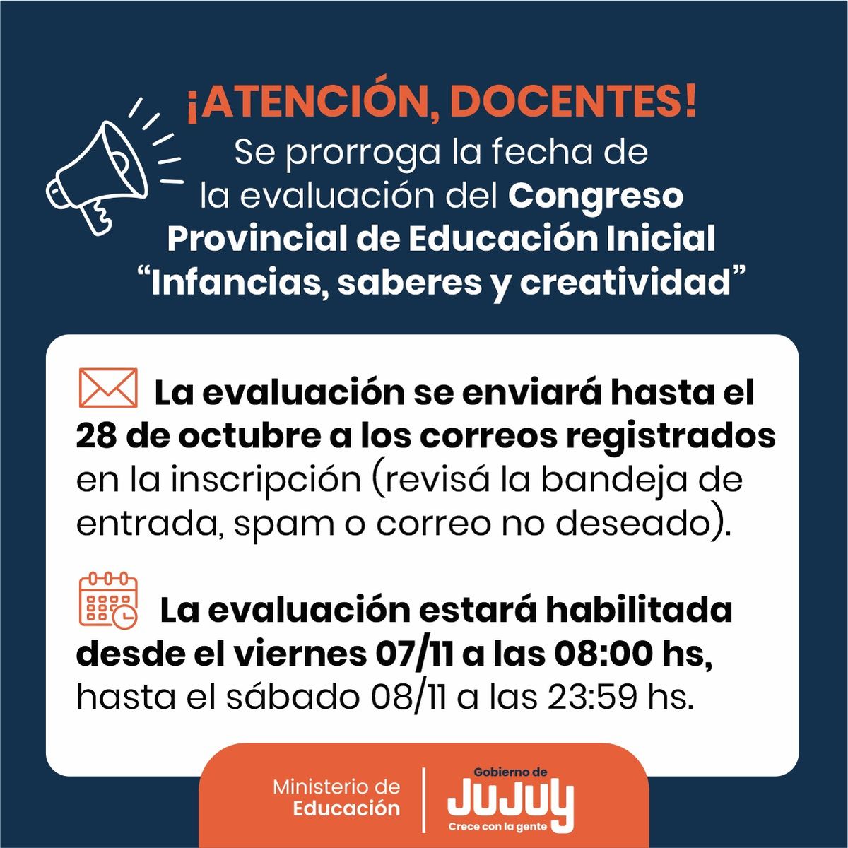 El Ministerio de Educación informa la prórroga de la evaluación correspondiente al Congreso Provincial de Educación Inicial “Infancias, saberes y creatividad”, desarrollado el pasado 6 de septiembre del corriente año, de manera simultánea en San Salvador de Jujuy y Libertador General San Martín.