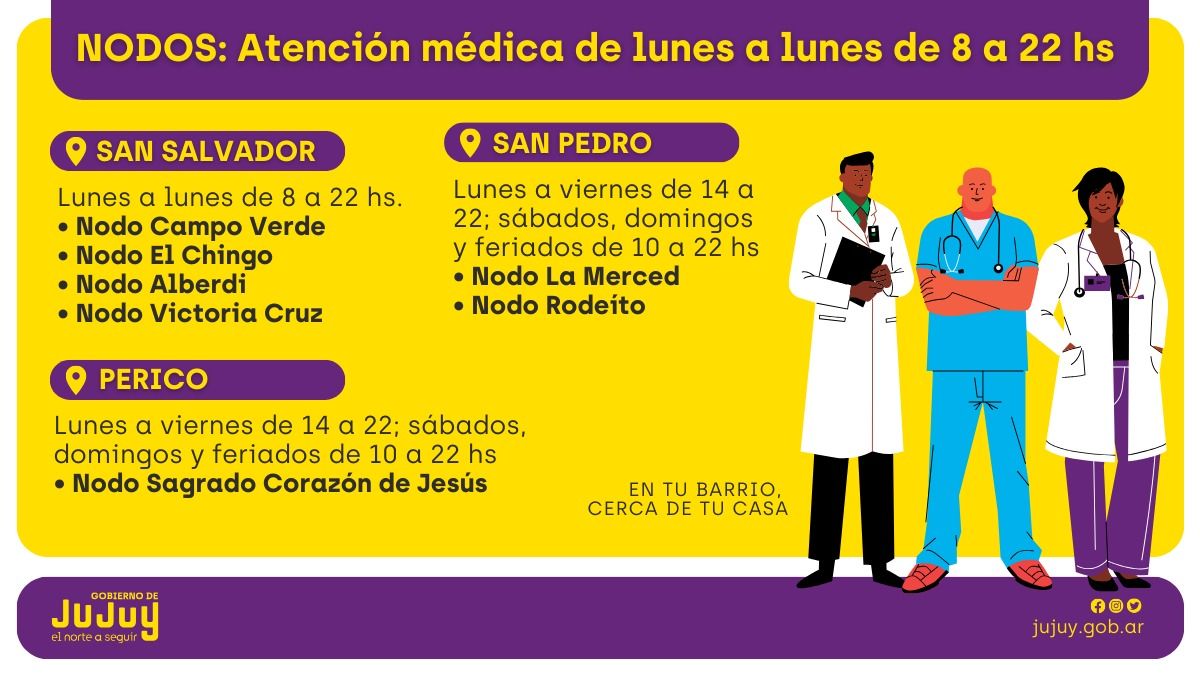 La modalidad de atención médica lunes a lunes ya se efectúa en los Nodos Campo Verde, El Chingo, Alberdi y Victoria Cruz de la capital jujeña, en Nodo La Merced de San Pedro y en Nodo Sagrado Corazón de Jesús de Perico incorporando desde ahora también al Nodo Rodeíto sobre Ruta N° 1.