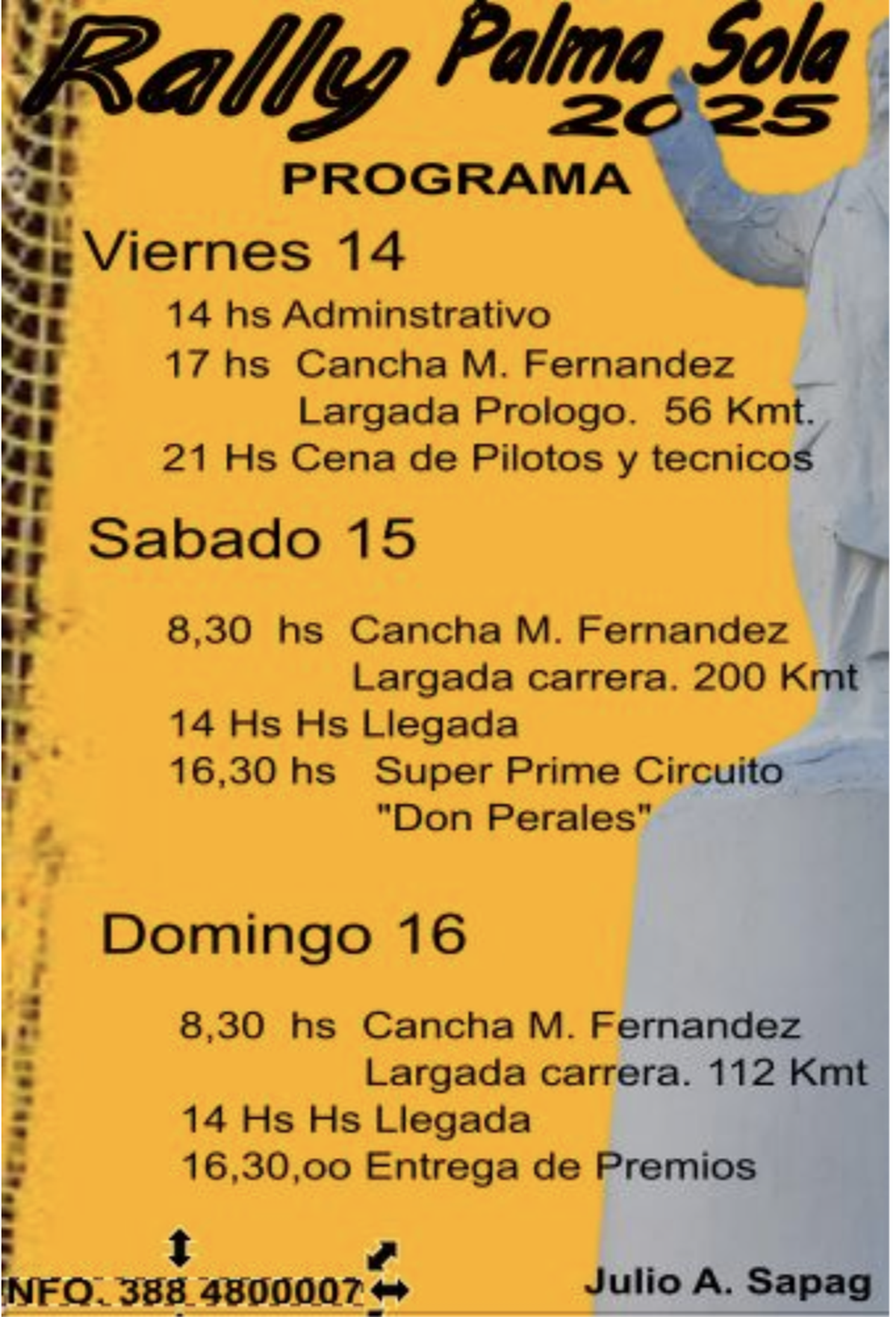La jornada final comenzará a las 8:30 con la largada desde la Cancha M. Fernández. Los pilotos encararán un recorrido de 112 kilómetros por la Ruta 25, con tramos en Palma Sola y Maíz Gordo (ida y vuelta). El regreso está programado para las 14 horas.