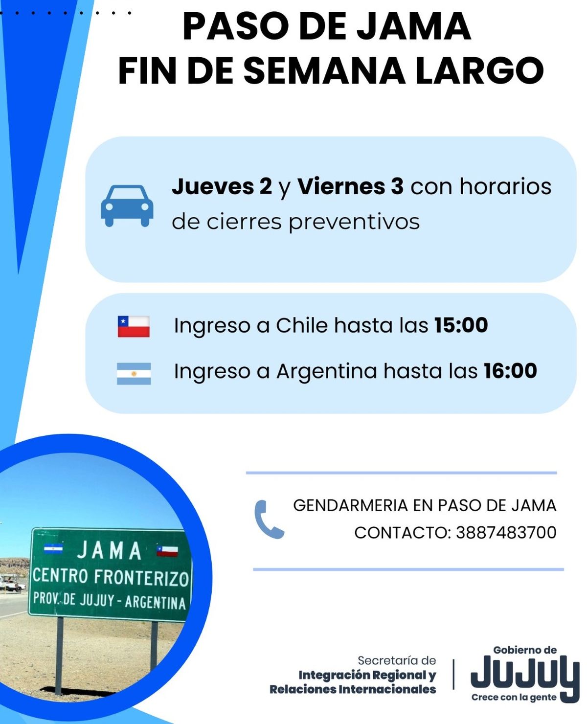 La Secretaría de Integración Regional y Relaciones Internacionales informó que, por determinación de autoridades internacionales, el Paso de Jama registrará cierres preventivos para todo tipo de vehículos los días jueves 2 y viernes 3 de abril.