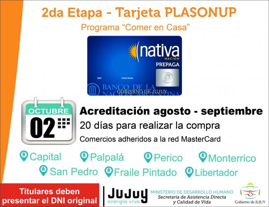 El Ministerio de Desarrollo Humano, a través de la Secretaría de Asistencia Directa y Calidad de Vida, comunicó que hoy miércoles 2 de octubre se realizó la acreditación de la Segunda Etapa de Tarjetas PLASONUP correspondiente a los meses de agosto y septiembre, para aquellas personas titulares del Programa Comer en Casa, que retiraron este beneficio en el transcurso de la última semana.